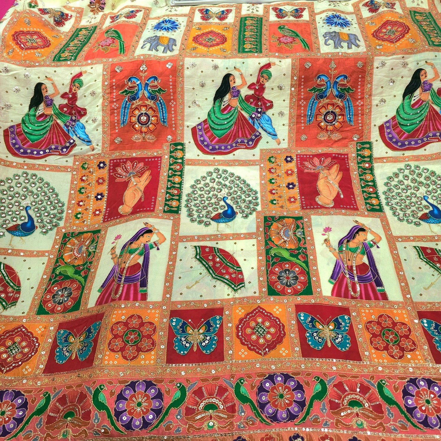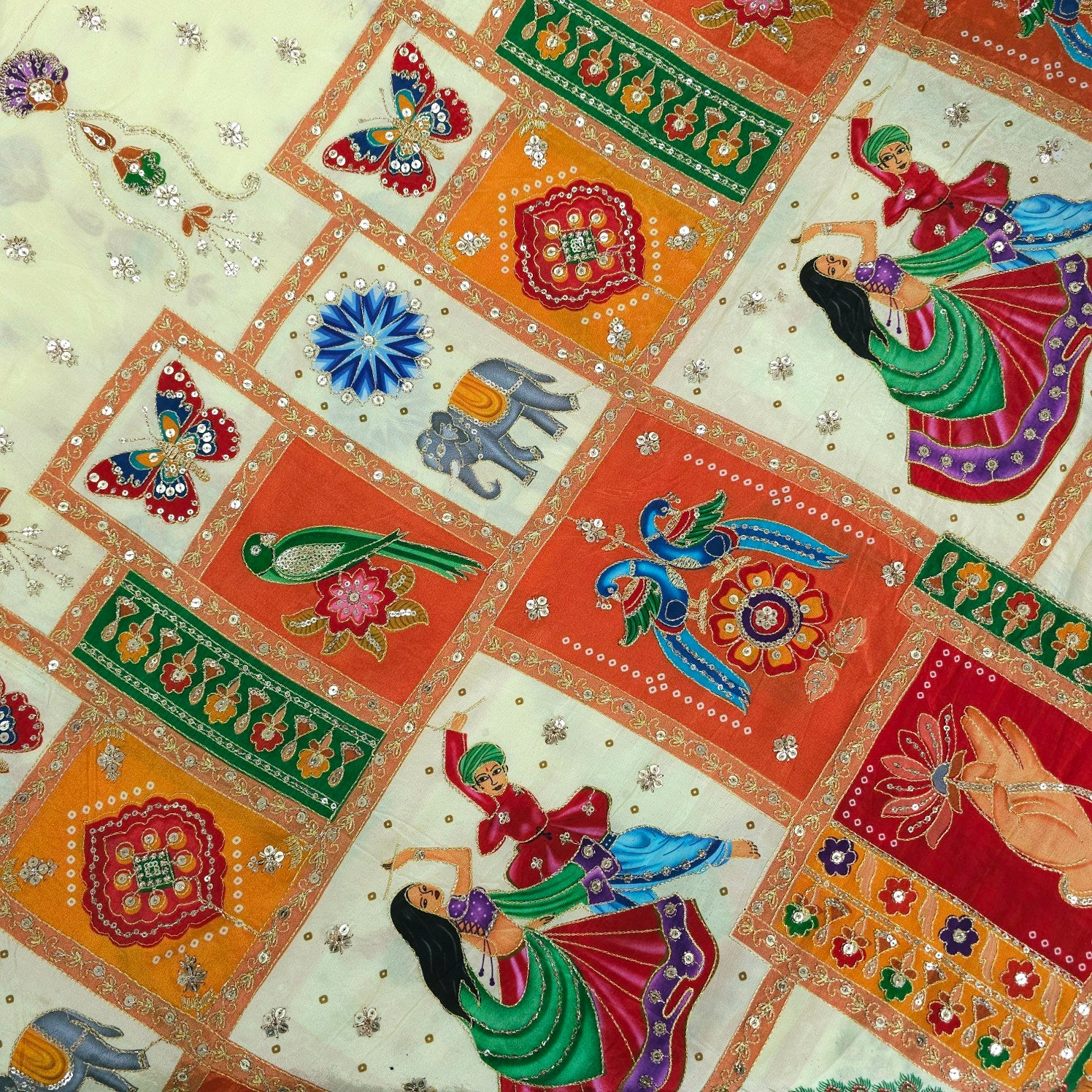 These vibrant embroidered fabrics are designed on a soft, crepe base and feature intricate traditional motifs such as dancing figures, butterflies, flowers, peacock and decorative elements. Highlighted with zari thread and shimmering sequins. The intricate motifs create a charming, festive look that’s perfect for ethnic and traditional ensembles with a light, graceful appeal specially for nauratri, garba, dandiya, diwali or any other festivals