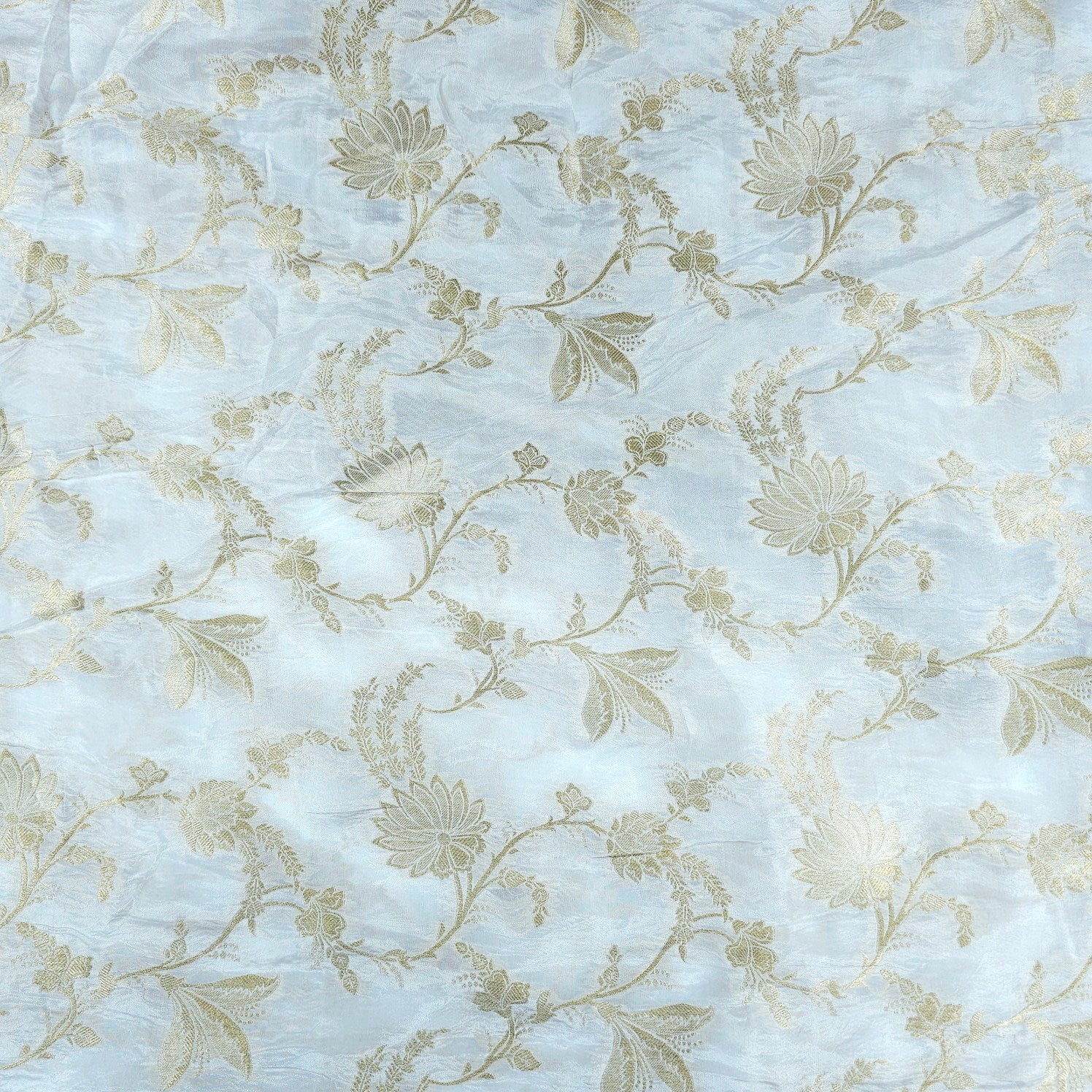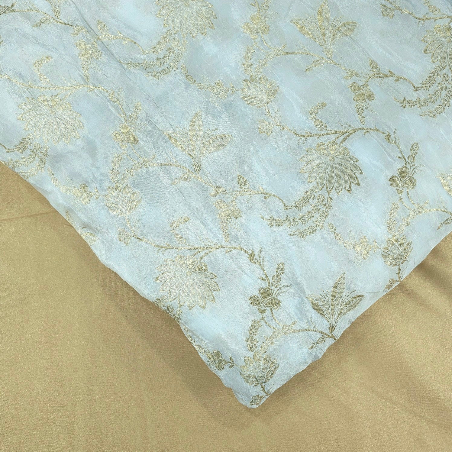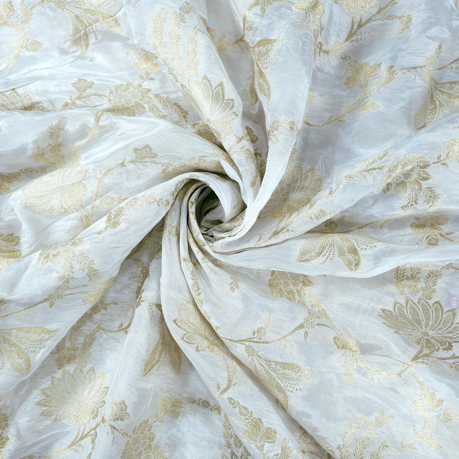 An elegant white dyeable crepe fabric featuring intricate golden floral vines woven throughout. The shimmering zari work contrasts beautifully with the base white, offering a sophisticated yet festive look. This fabric exudes luxury and is ideal for special occasions.