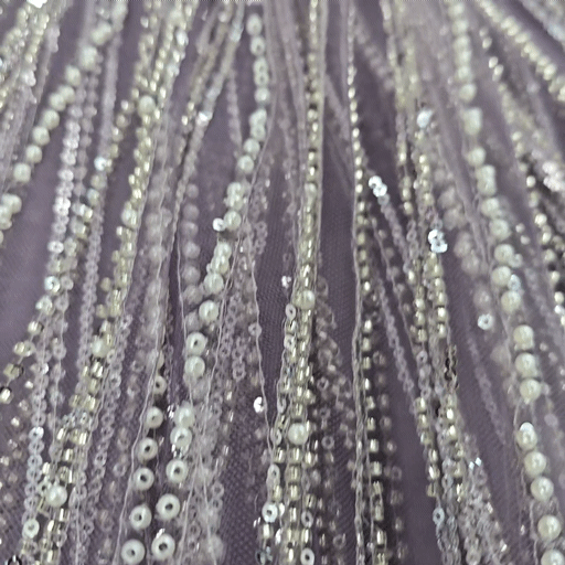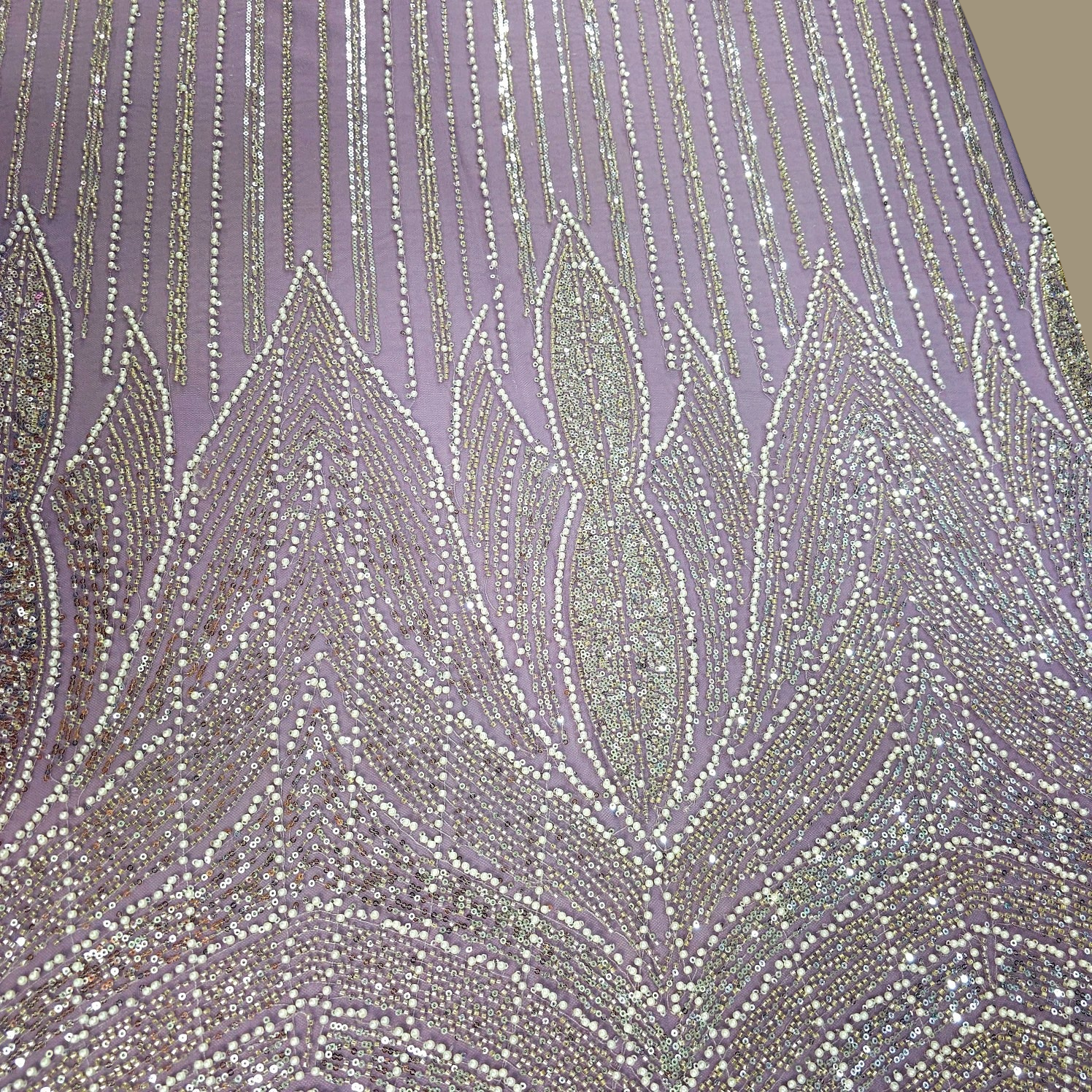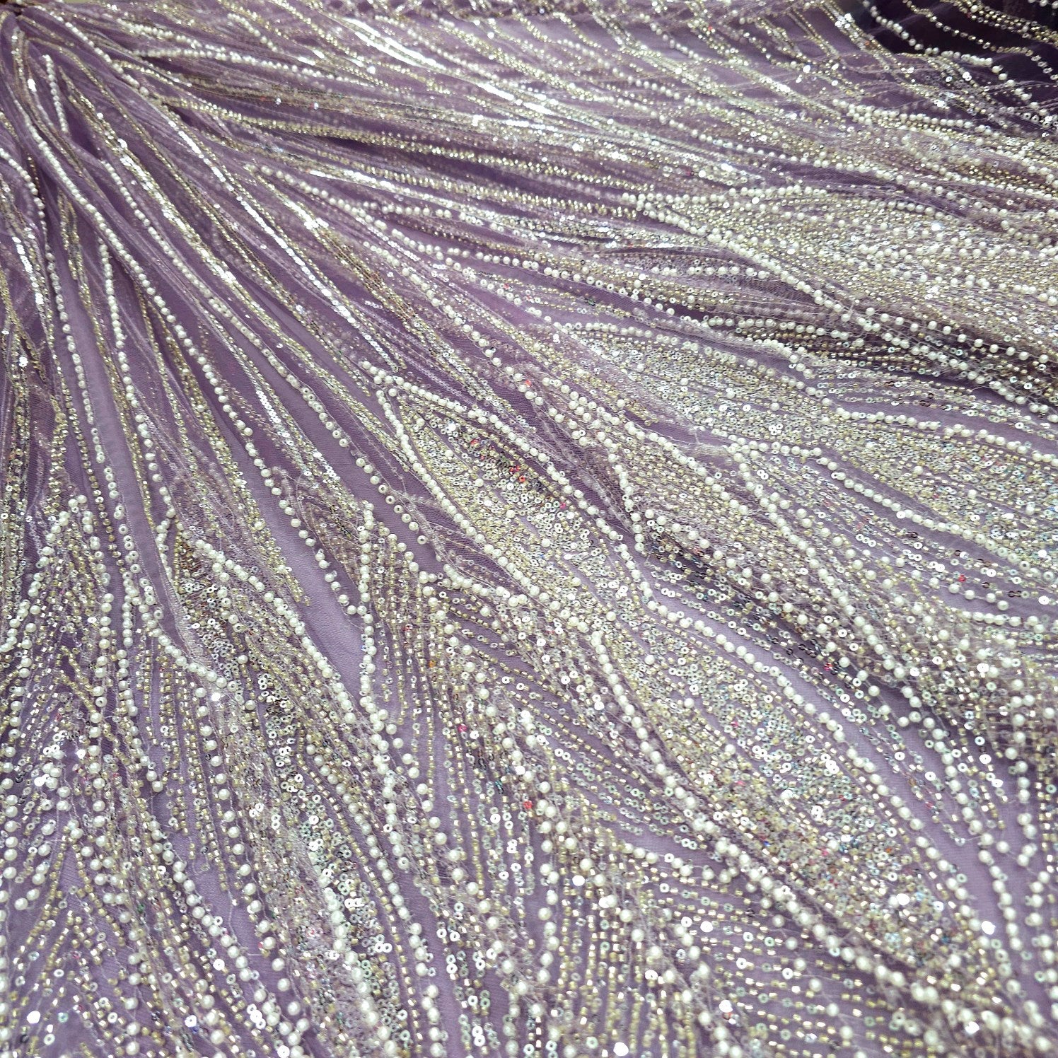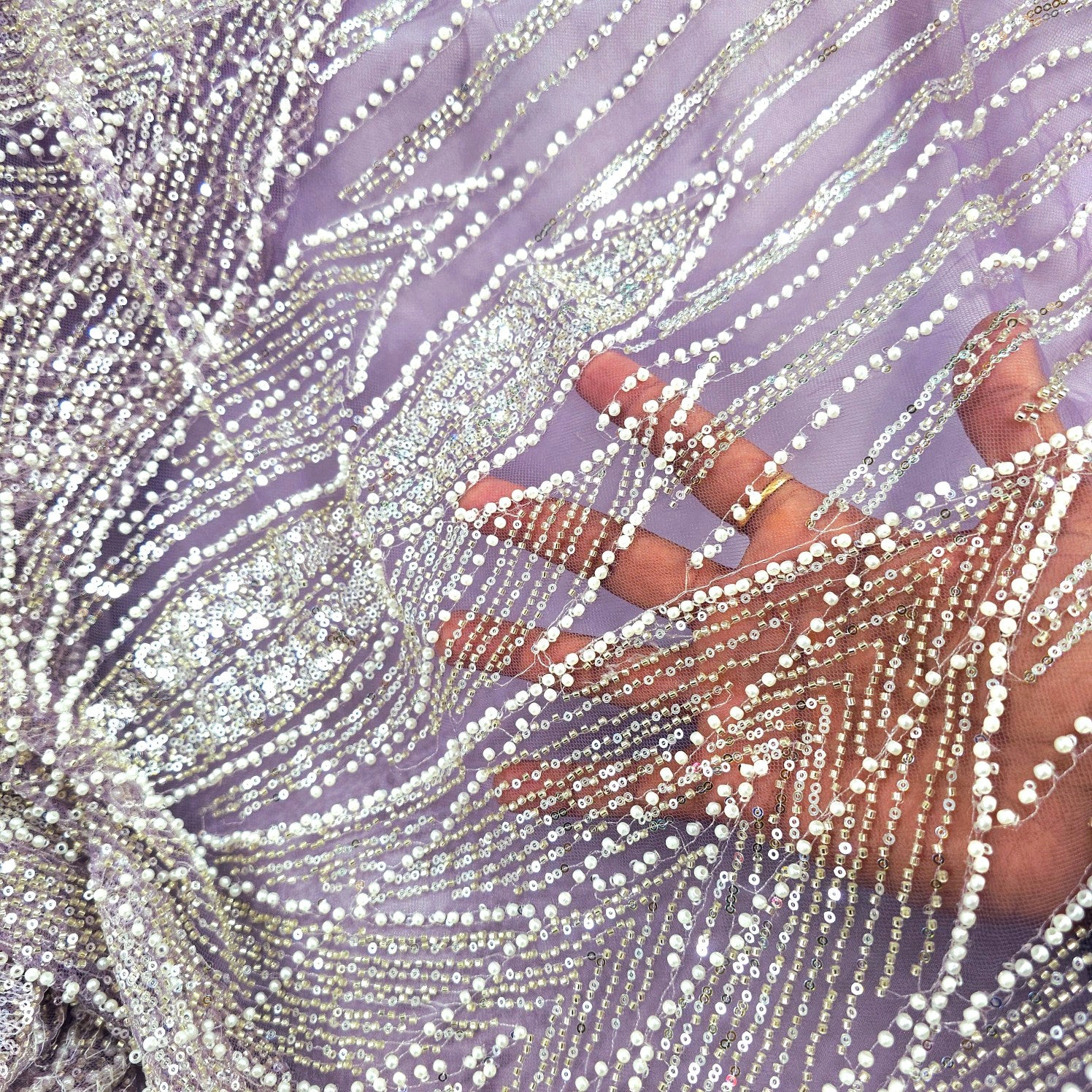 Elegant Lilac Purple Net Fabric with intricate sequin and bead embroidery, creating a shimmering leaf and wave-like pattern. The fabric has a luxurious, flowing texture, making it perfect for bridal wear, gowns, and evening ensembles.