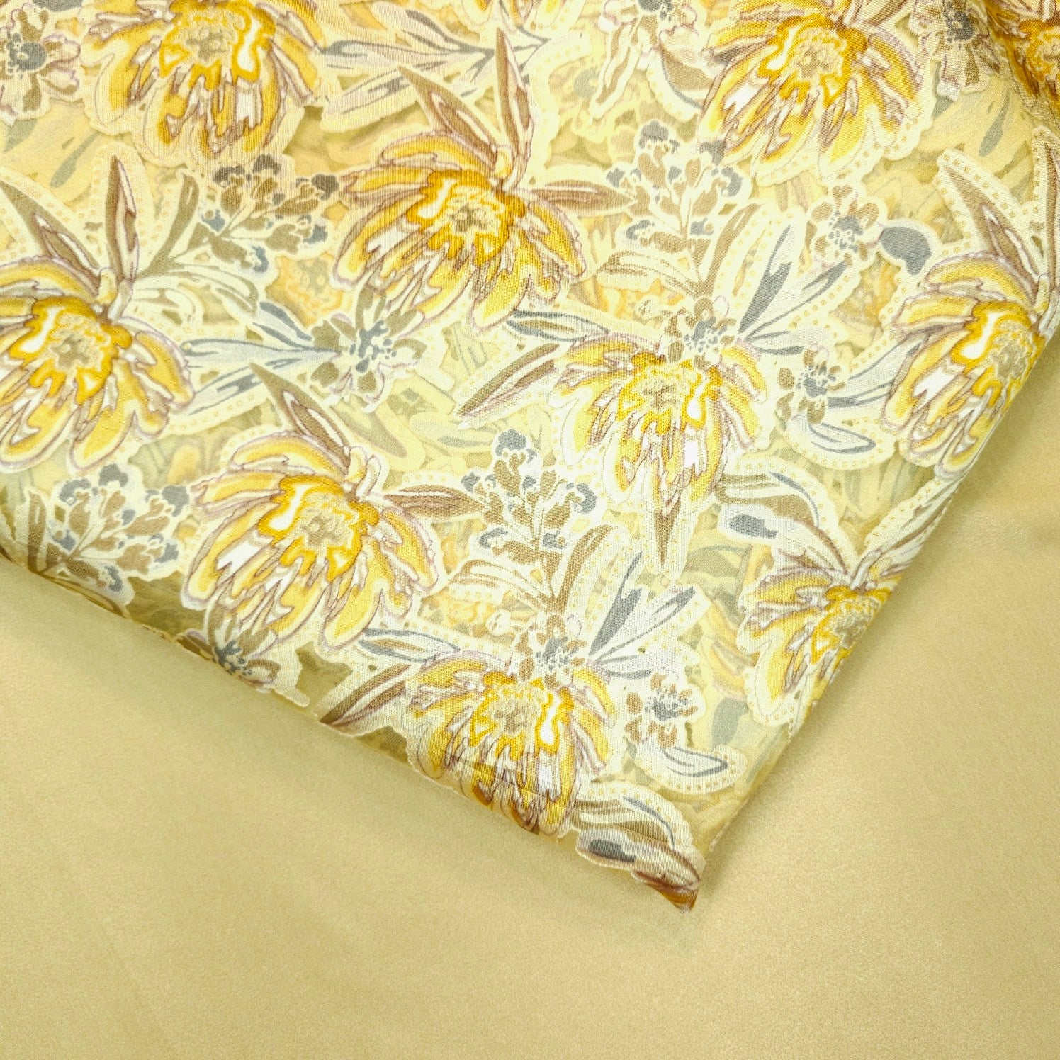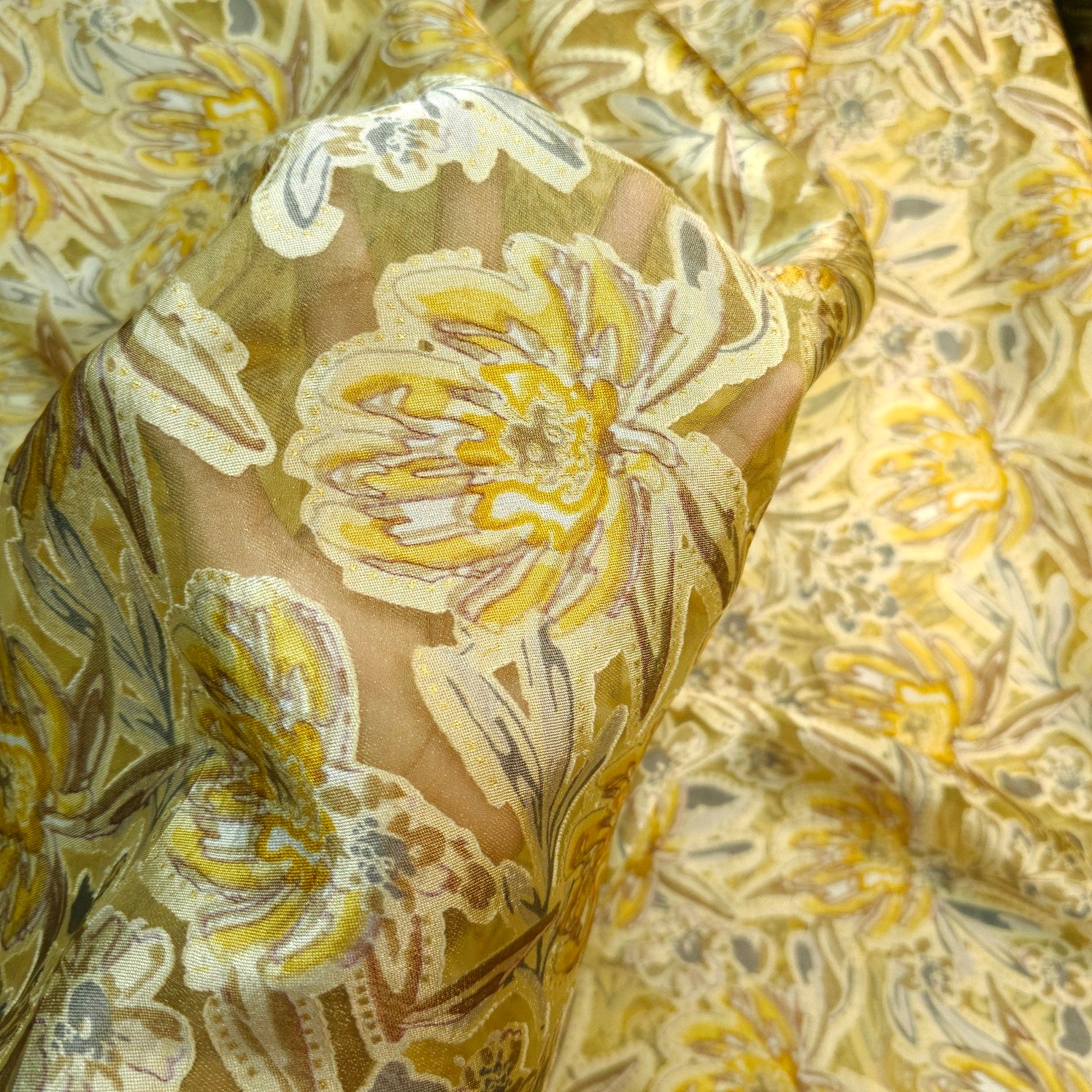 A lightweight and airy organza base brasso fabric with elegant digital prints and subtle Brasso (burnout) texture. The sheer base combined with velvet-like patterns creates a graceful contrast, enhancing the visual appeal. Its flowy nature makes it ideal for sarees, western dresses, one-piece gown, lehenga, anarkali and stylish kurtas that demand both charm and sophistication.