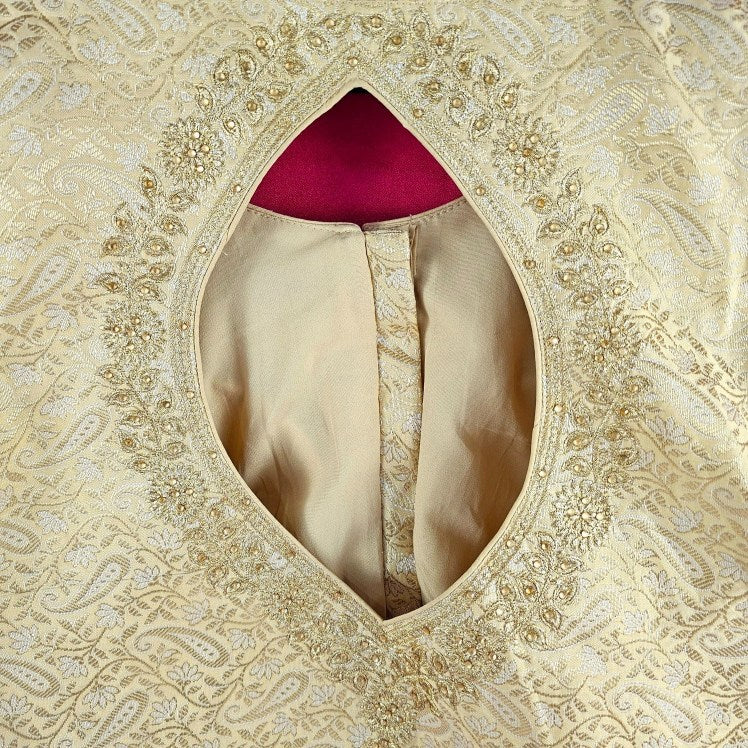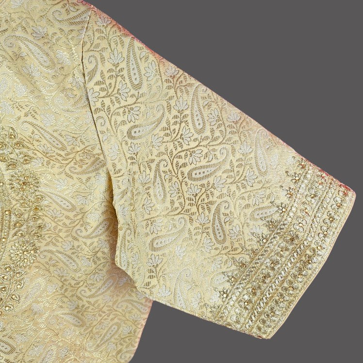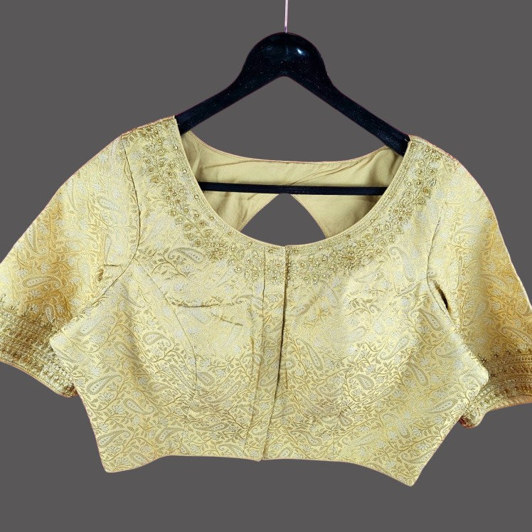 This Banaras brocade blouse features intricate zari work, exuding timeless elegance with its rich woven patterns. The round neckline complements the sophisticated design, while the covered back with a stylish keyhole detail adds a modern touch, and a decorative border on the sleeves making it perfect for festive and traditional wear.
