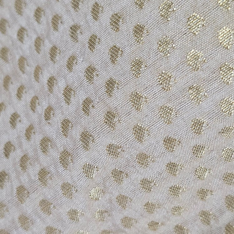 A brocade tissue base fabric blouse with a lustrous finish, featuring a classic round neckline and elegant short sleeves. The tailored design adds a sophisticated touch, making it perfect for traditional occasions. The tie-back detail enhances the overall fit and appeal.