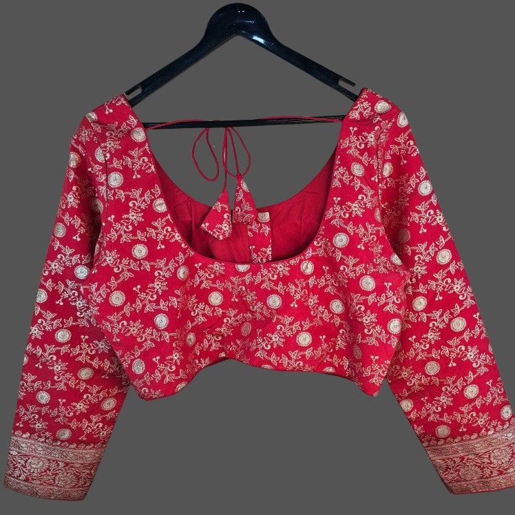 This is a traditional blouse with a rich colors base adorned with intricate flora; and circular motifs. The design features long sleeves, a deep back neckline with tie-up detailing, and a decorative border on the sleeves, giving it an elegant ethnic appeal