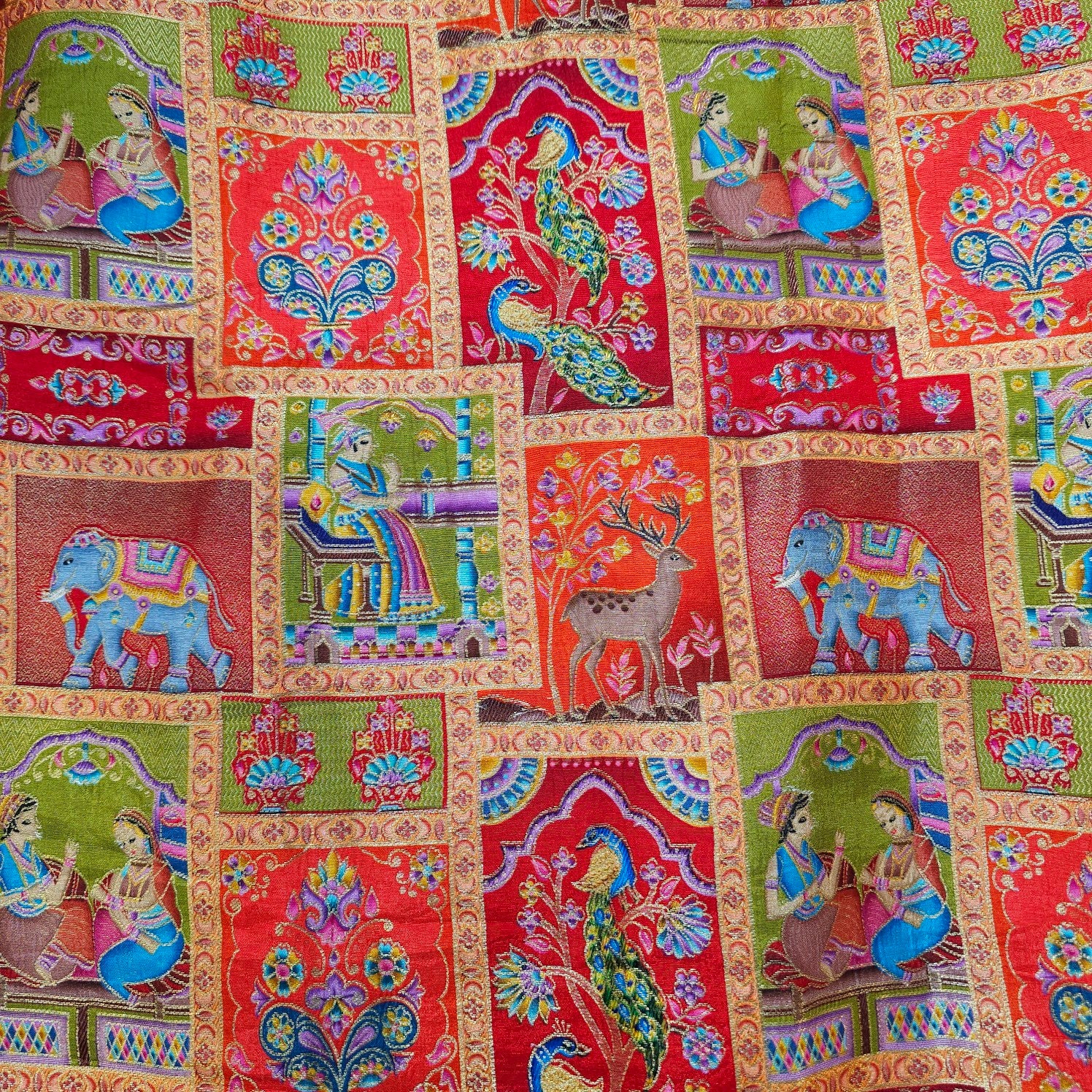 A luxurious Banarasi brocade fabric featuring intricate position print and floral & animalmotifs woven with fine zari and resham threads. The exquisite weaving technique adds depth and vibrancy, making it a perfect choice for ethnic and festive wear.