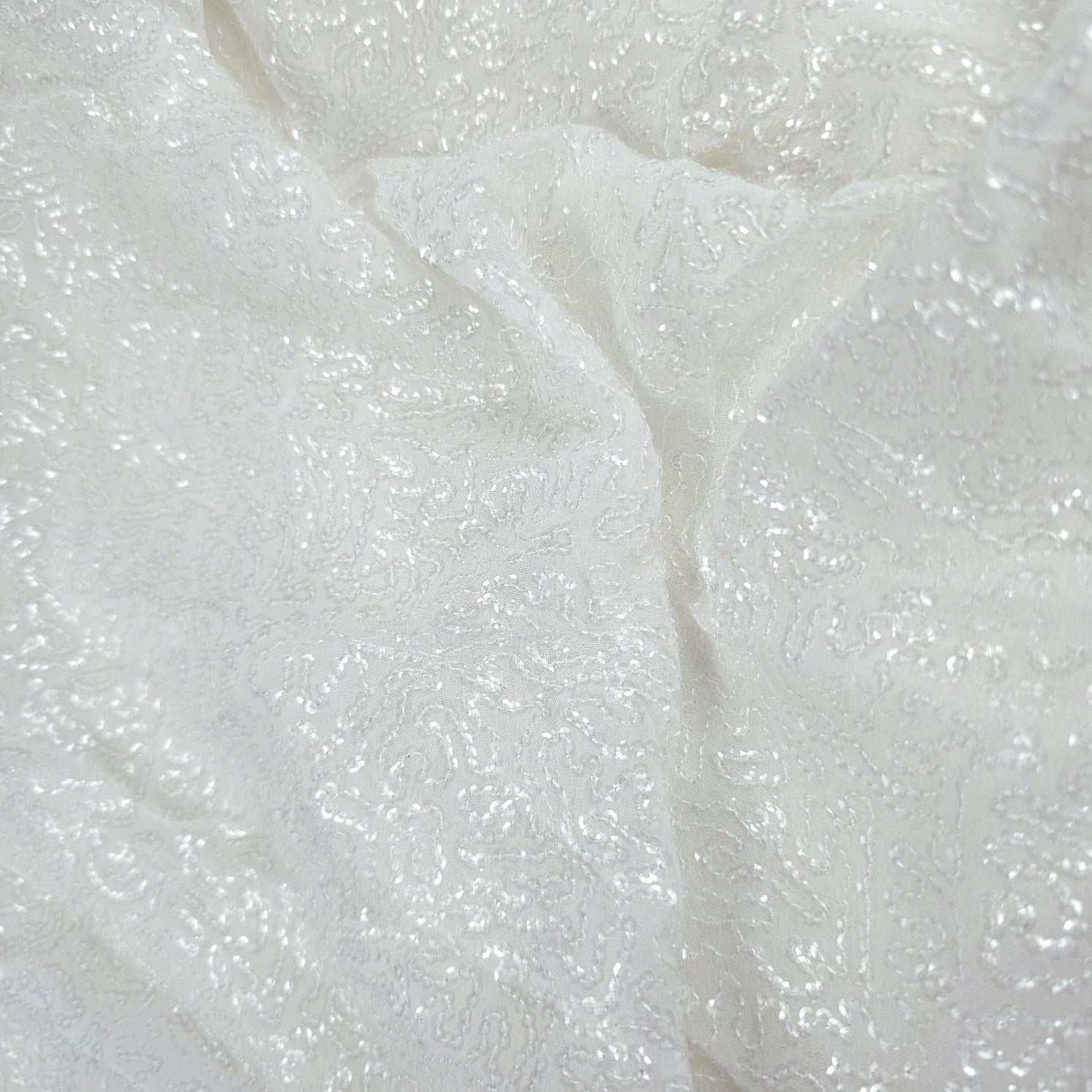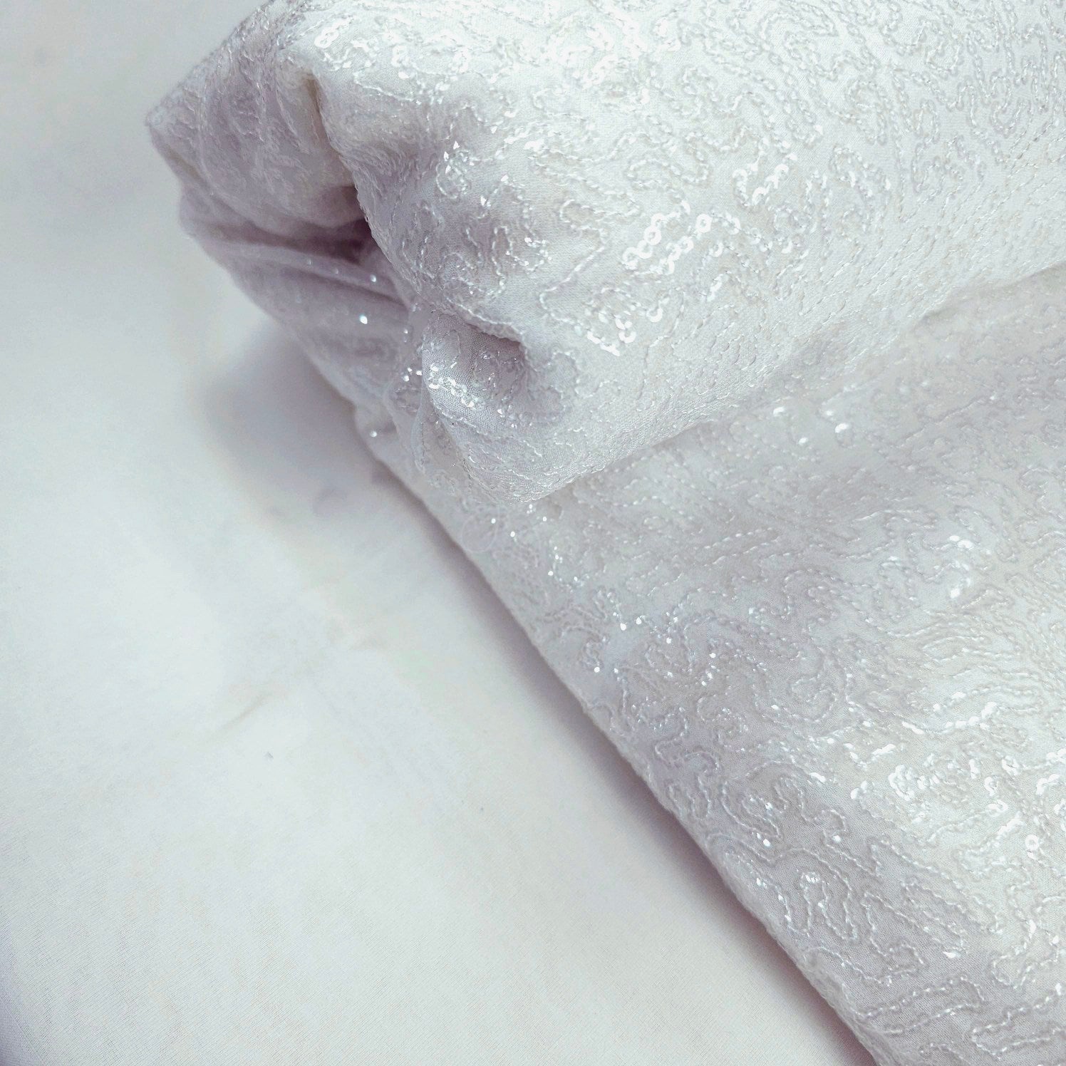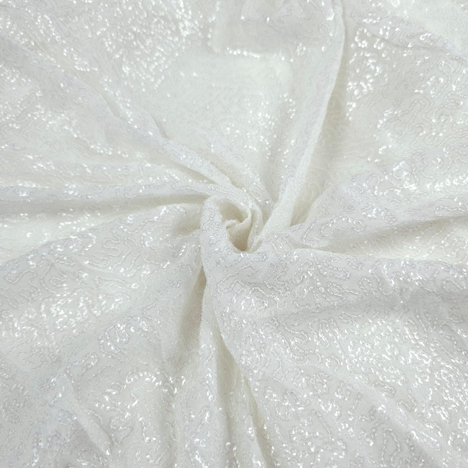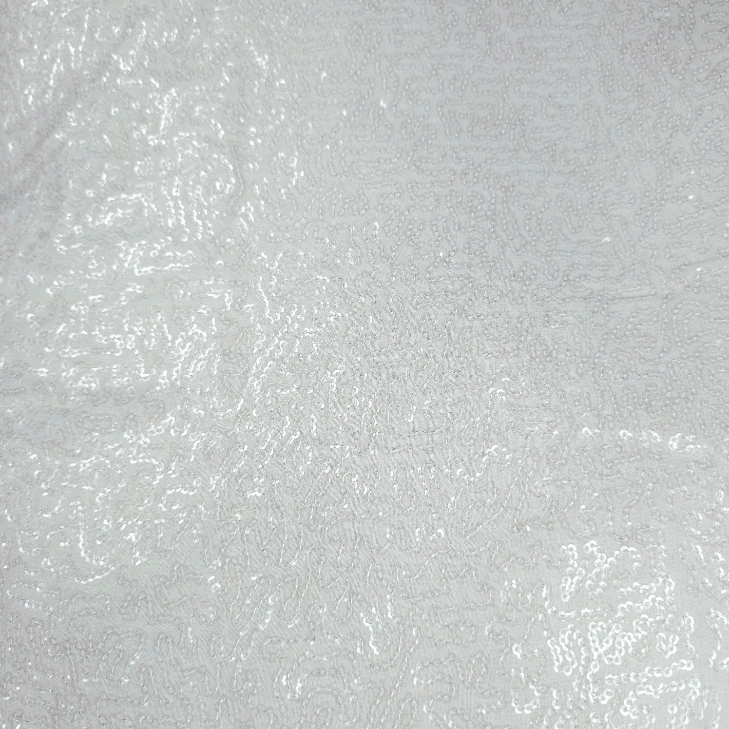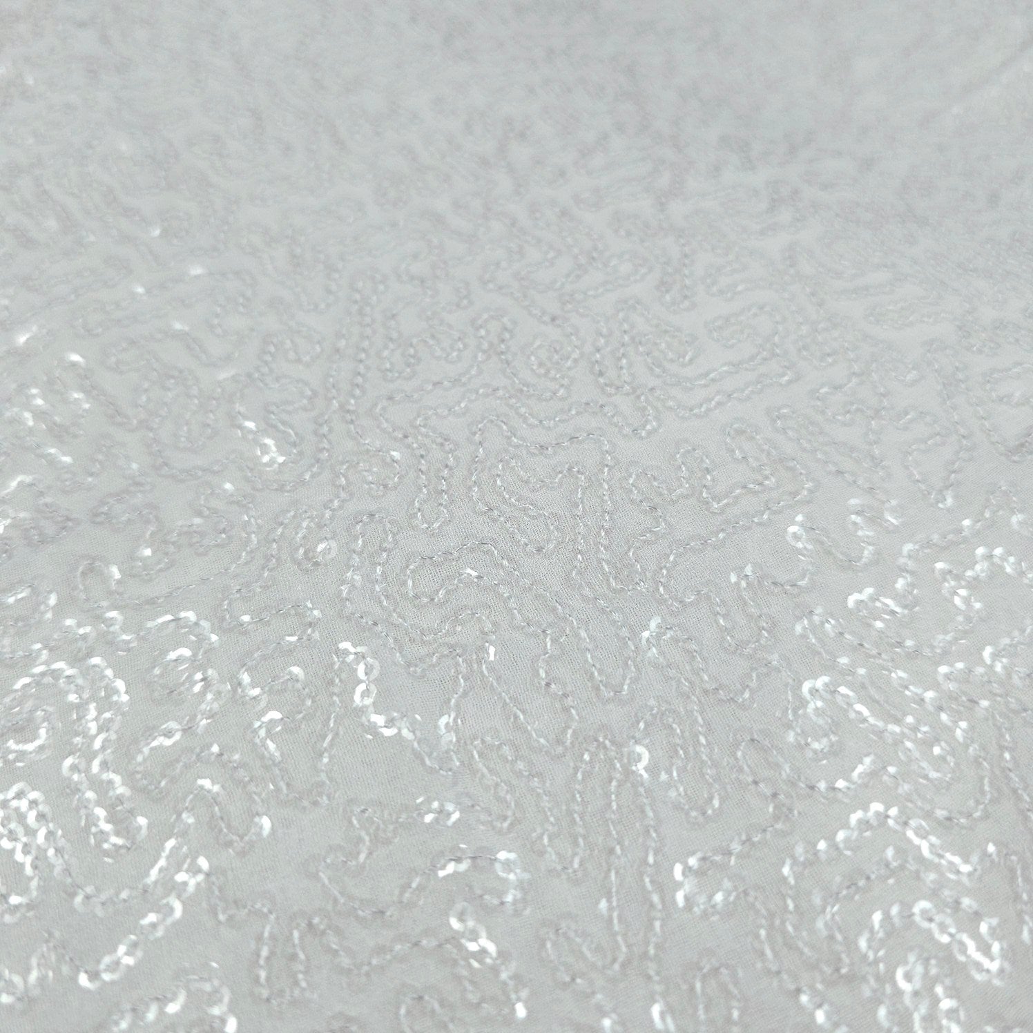 A stunning fabric with understated elegance, this icy white abstract sequin fabric reflects light in a subtle, pearlescent glow. Its tone-on-tone embroidery adds texture and richness, making it a versatile option for contemporary and festive designs.
