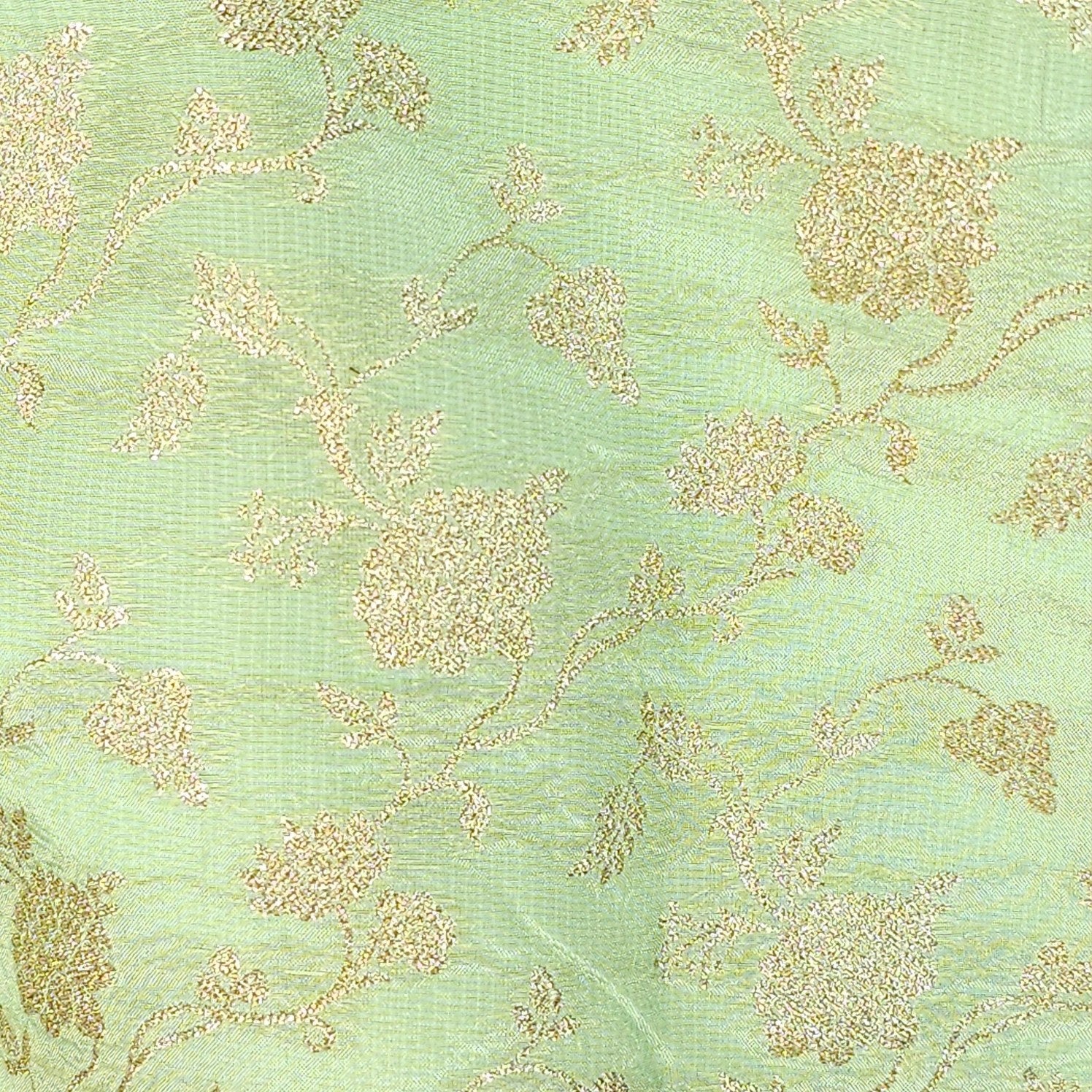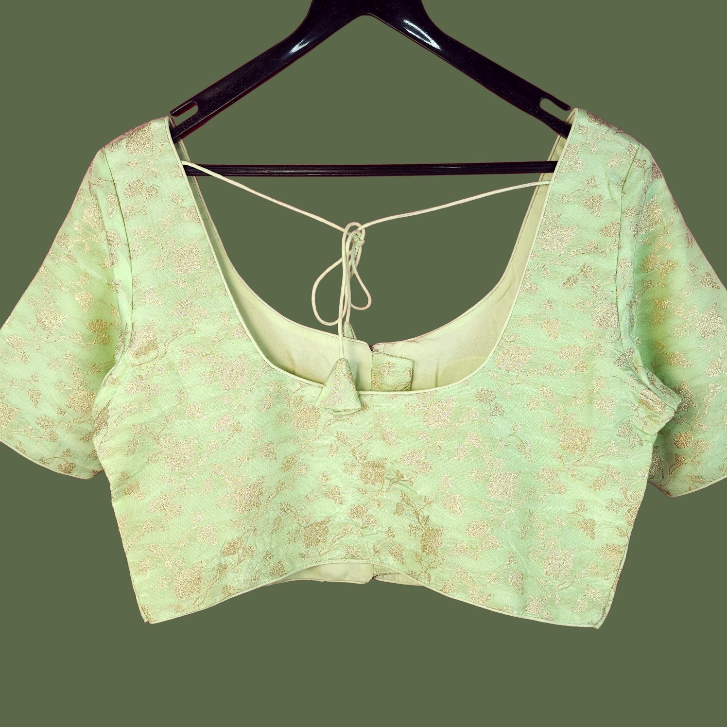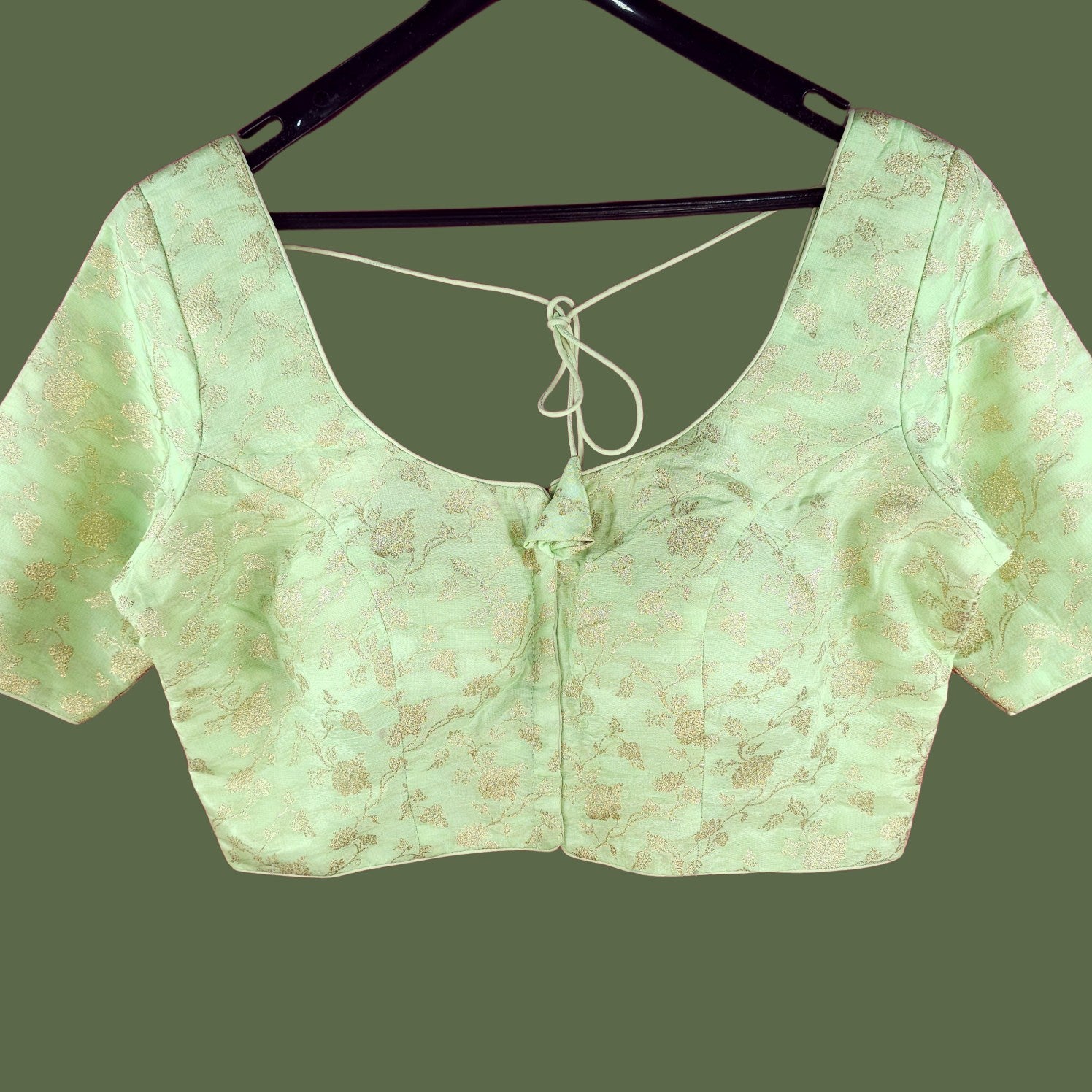 This soft pastel green color blouse features delicate golden floral weaving, giving it a subtle yet sophisticated charm. The wide round neckline and tie-up back add a graceful finish. Perfect for light festive occasions, day weddings, or elegant traditional looks.