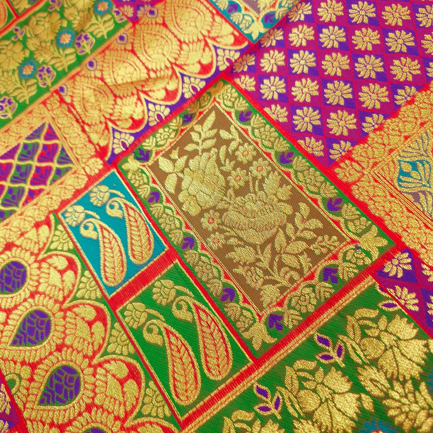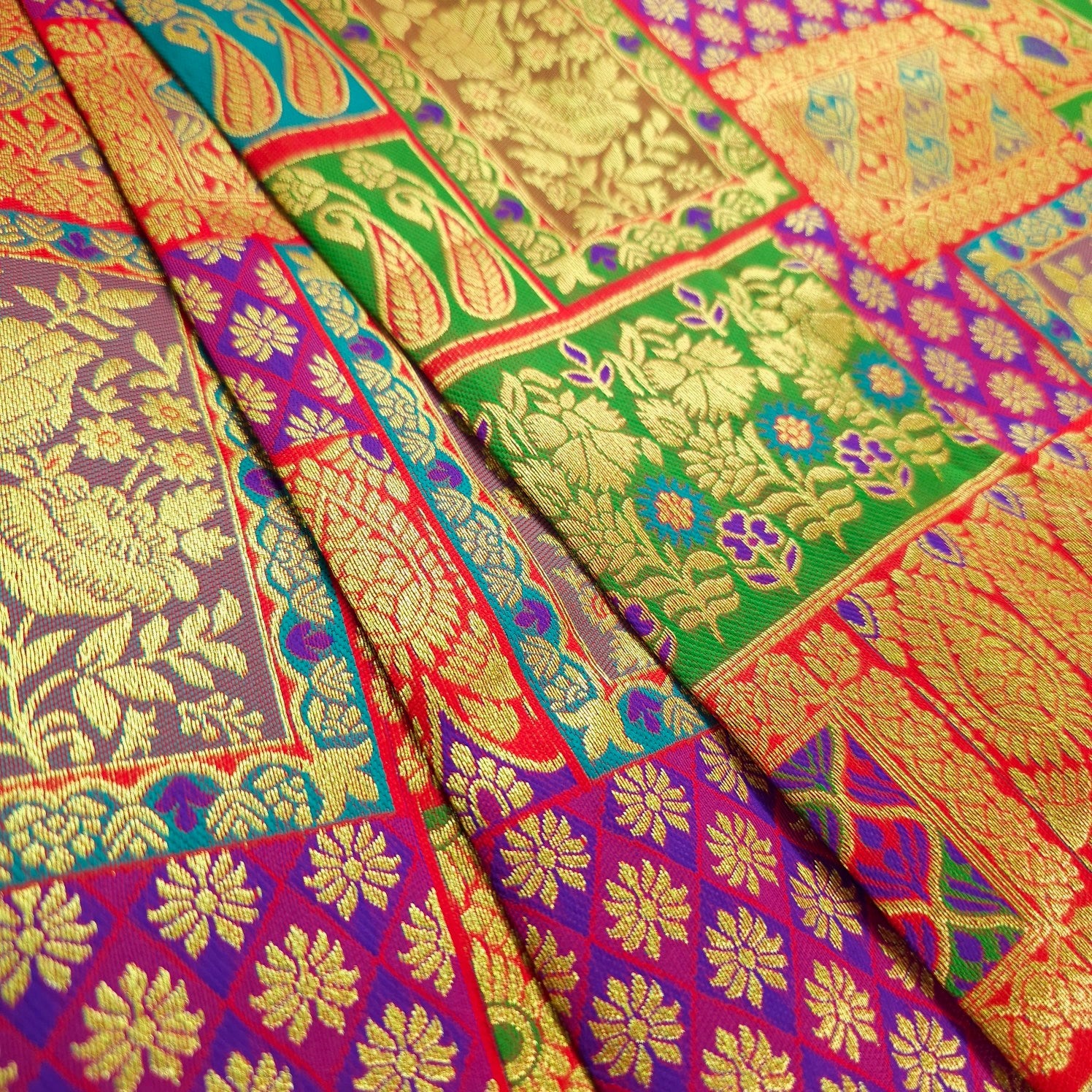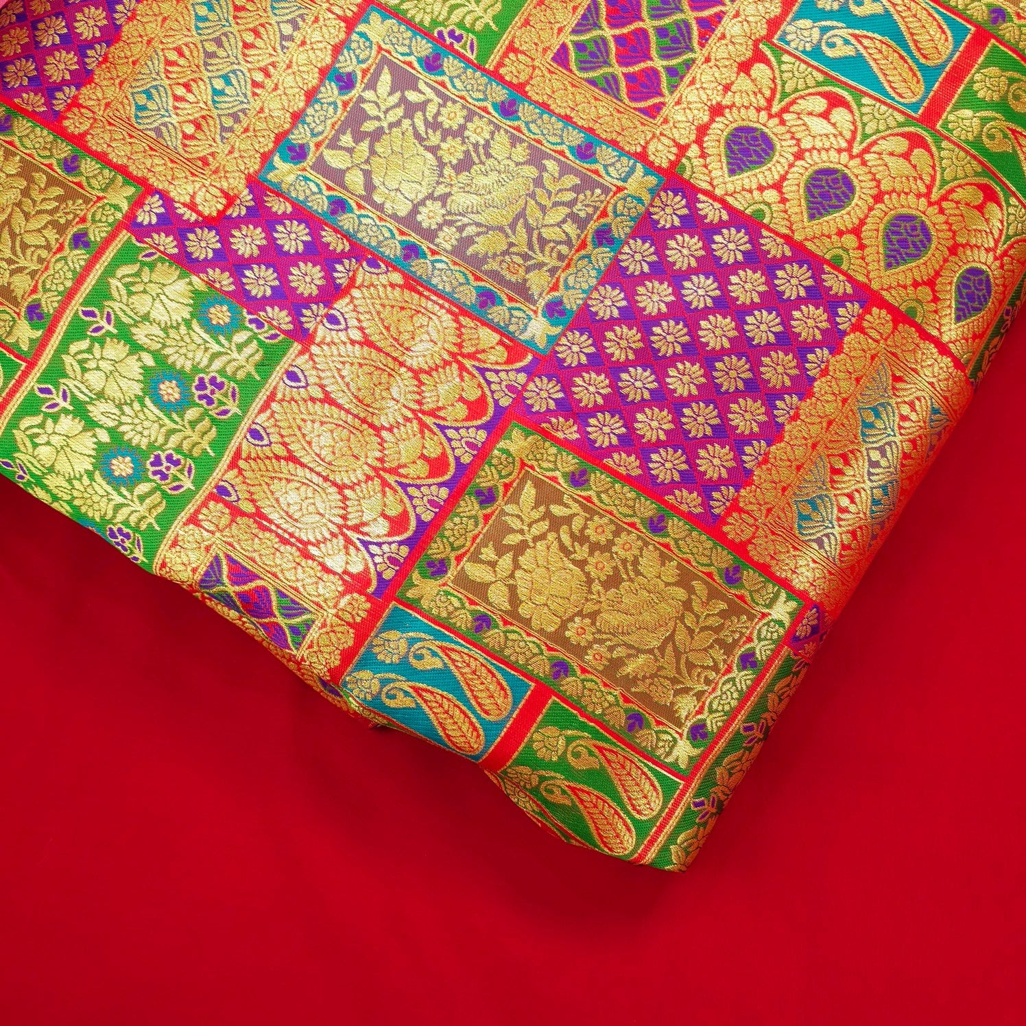 An exquisite range of multicolor Banaras brocade on silk fabric, showcasing the opulence of traditional weaving. Woven with intricate golden zari, these fabrics highlight a rich motifs—florals, paisleys, and folk-inspired designs. The natural sheen of silk paired with vibrant hues creates a luxurious base, perfect for statement ethnic outfits that embody grace and heritage.